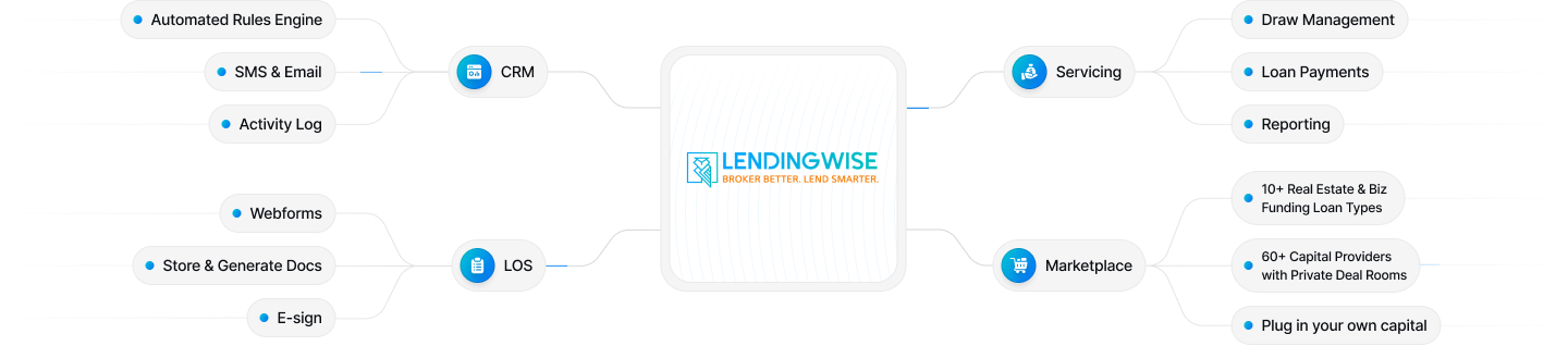 The LendingWise lending CRM software & loan origination software platform was built to help manage the entire lending tech stack from CRM, LOS, Pricing Engine (PPE), Servicing software & deal placement via lender marketplace. Organizations can now deploy a lending software platform in days vs months compared to many off the shelf loan management software providers or choosing to custom build your own loan origination software solution. No other CRE private lending software provides as many features and functionality out of the box, like LendingWise