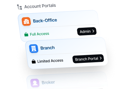 Enable multi-level access for back-office, branch, and broker teams with dedicated portals and permissions for each user type.